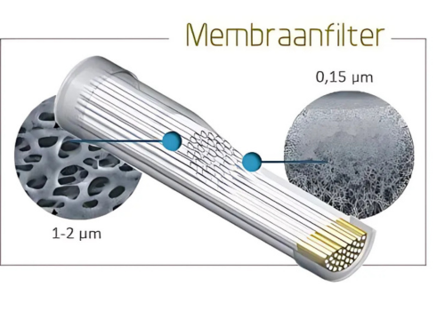 Het leidingwater stroomt door de membraan microfilter. De poriën van de membranen houden partikels groter dan 0,15 micrometer tegen. 99,9999% van alle bacteriën en resten van vaste afvalstoffen worden verwijderd. Kalkaanslag wordt gereduceerd.